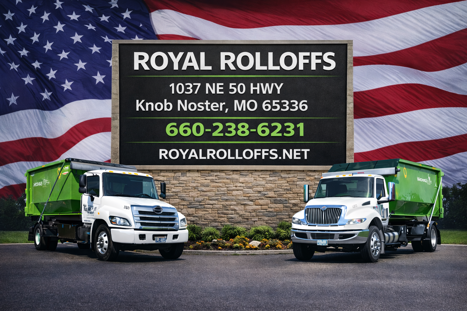 Royal Rolloffs Midwest Division specializes in residential dumpster rental service in Knob Noster, Mo and the surrounding Johnson County, Henry County, Pettis County and Lafayette County communities. Whether you are cleaning out a home, remodeling a kitchen, replacing a roof, building a new home, or handling a full estate cleanout, we deliver the right size dumpster quickly and pick it up promplty when you are finished loading the dumpster.